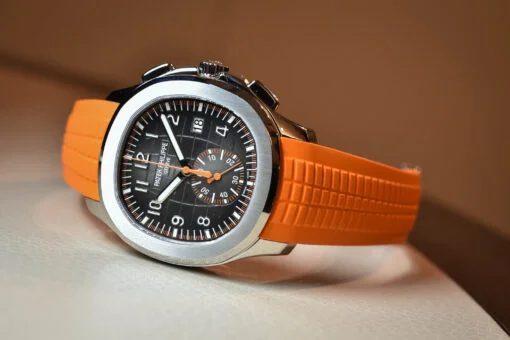 The Aquanaut features a bold rubber strap, which adds comfort and durability. Its dynamic orange dial is complemented by luminous markers, ensuring readability in various lighting conditions, making it perfect for both casual and formal occasions.